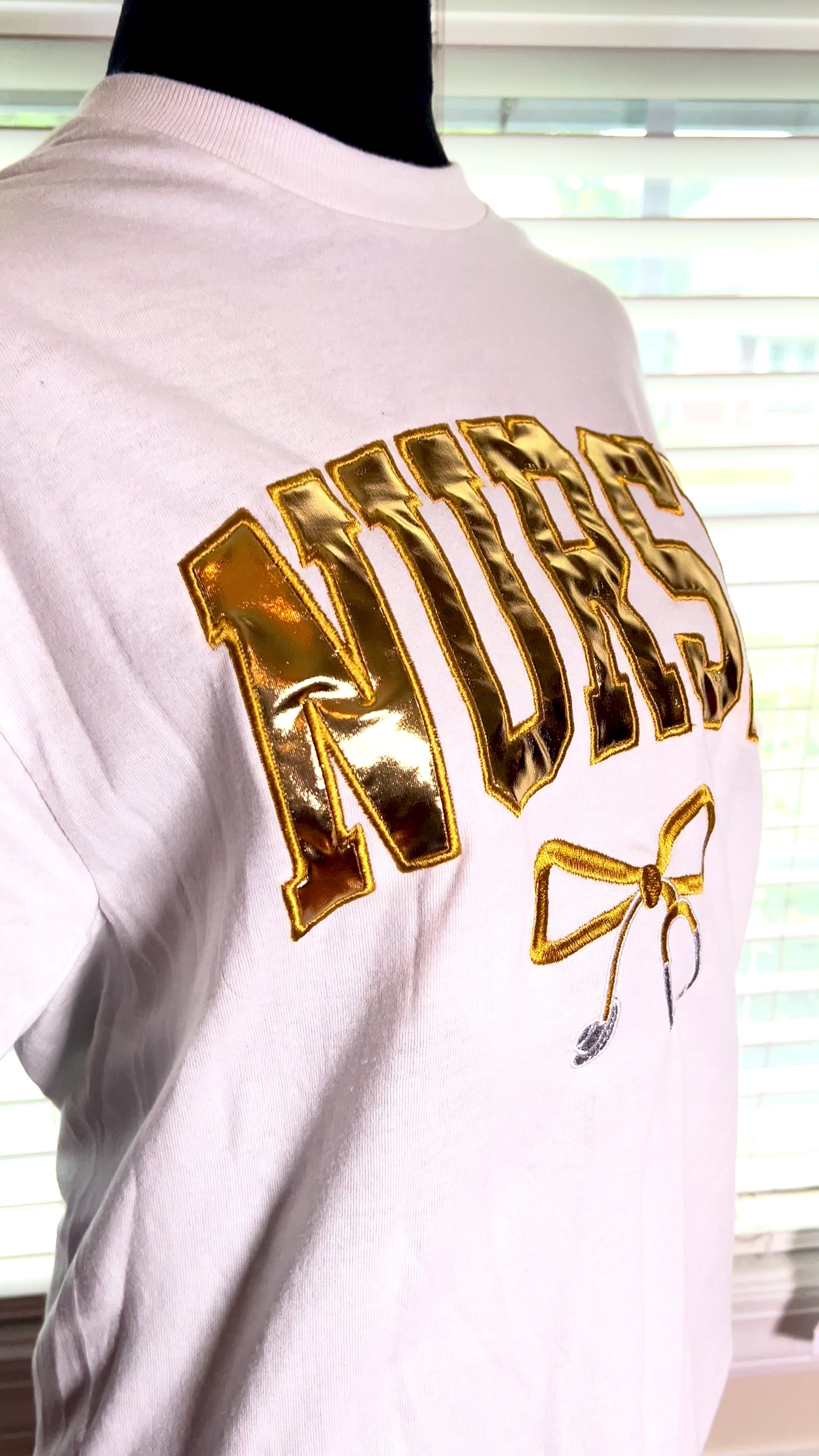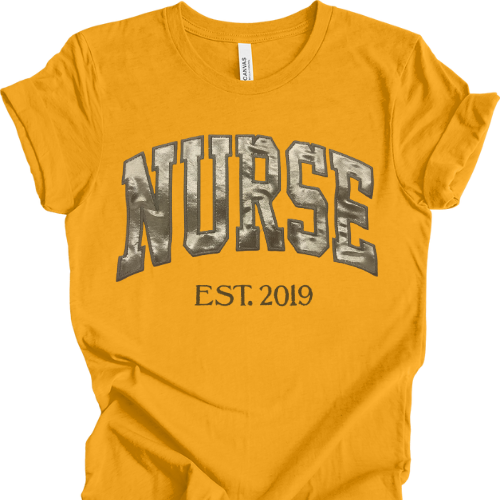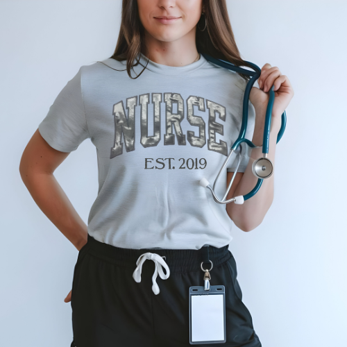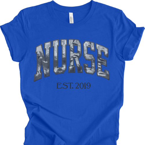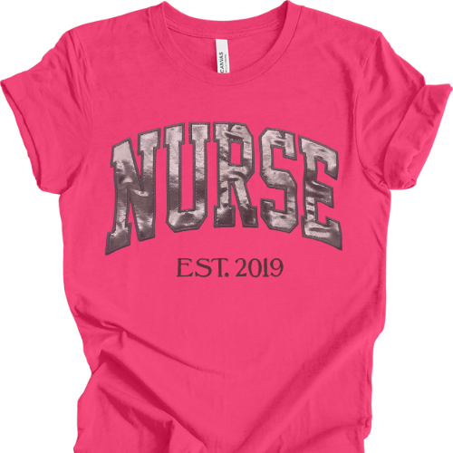 A design where bold style meets feminine flair. This eye-catching t-shirt features the large letters "NURSE" in a stunning metallic pattern, giving it a glamorous and trendy appearance. Made from premium, soft cotton, it provides all-day comfort whether you're on a shift or enjoying your day off. Perfect as a gift for nursing students, recent graduates, or seasoned professionals, this t-shirt is designed to celebrate and empower. Available in multiple colors, this top-rated tee is a standout addition to any nursing wardrobe.